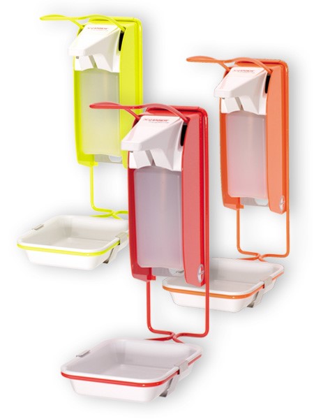 Дозатор сигнального цвета для жидкого мыла, крема и дезинфицирующего средства.